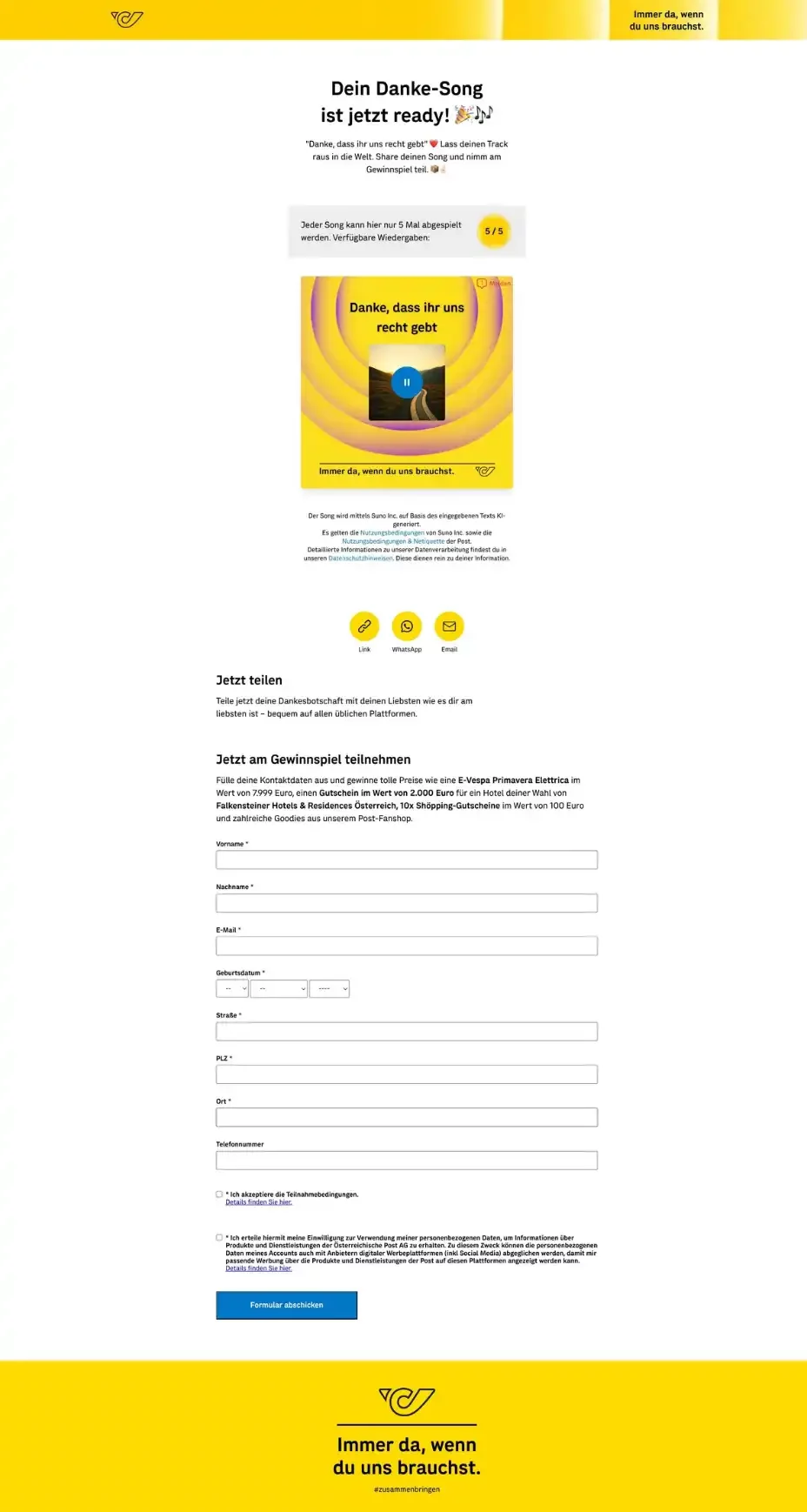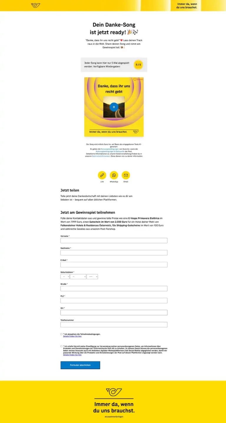 Umgesetzt haben wir die Experience als KI-gestützte Song-Plattform, auf der persönliche Botschaften in konsumier- und teilbare Songs verwandelt wurden. Zentraler Einstiegspunkt war die Landingpage soundofdanke.at, welche die gesamte Journey bündelte und auf Tempo, Klarheit und sofortige Belohnung optimiert war. In der Kommunikation setzte die Kampagne auf einen konsequenten Dialog-first-Ansatz: Der Schwerpunkt lag auf Direct Mailing und E-Mail, verstärkt durch Social und Display. Als zusätzlicher Participation- und Consent-Treiber wurde ein Gewinnspiel integriert – als zusätzlicher Mitmach-Anreiz nach dem eigentlichen Kernmoment, dem Song.