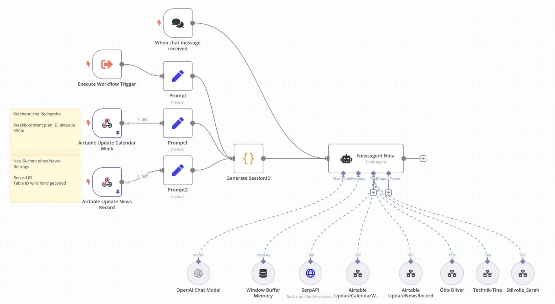 Nina durchsucht autonom wöchentlich relevante Branchennews und fasst sie strukturiert zusammen. Für Google-Recherchen nutzt sie das Webscraping-Tool Serpapi. Sie bewertet Treffer nach Relevanz, Markenfit und Tonalität und speichert alles in Airtable. Besonders effizient wird sie durch „Execute Workflow Trigger“ und „When chat message received“: So kann Jürgen sie anstoßen – oder sie läuft unabhängig zur Validierung. Die Übergabe an Jürgen oder direkt an Nutzer:innen erfolgt per Session-ID und sauberem JSON.