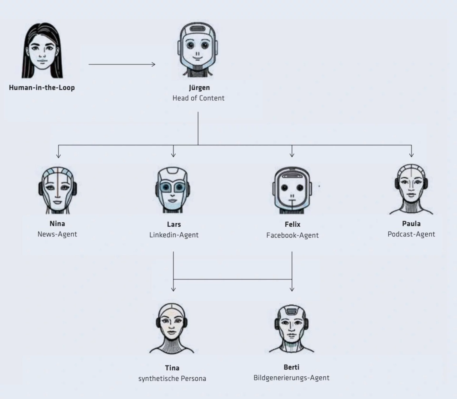 Im Leaders Lab entstand ein Setup, das an klassische Marketingorganisationen erinnert – nur digital skaliert. Im Zentrum: Manager-Agent Jürgen als Head of Content und Single Point of Contact. Ergänzend wirken Nina (News), Felix (Facebook), Lars (LinkedIn) und Paula (Podcast-Automation). Die Namensgebung macht Zuständigkeiten sofort klar. Lars und Felix bringen Mini-Teams mit: Bild-Berti (Visuals) und Technik-Tina (synthetische Persona für Tech-Zielgruppen). Wer Rollen und Abläufe sauber definiert, schafft Transparenz und kann Änderungen schnell ausrollen.